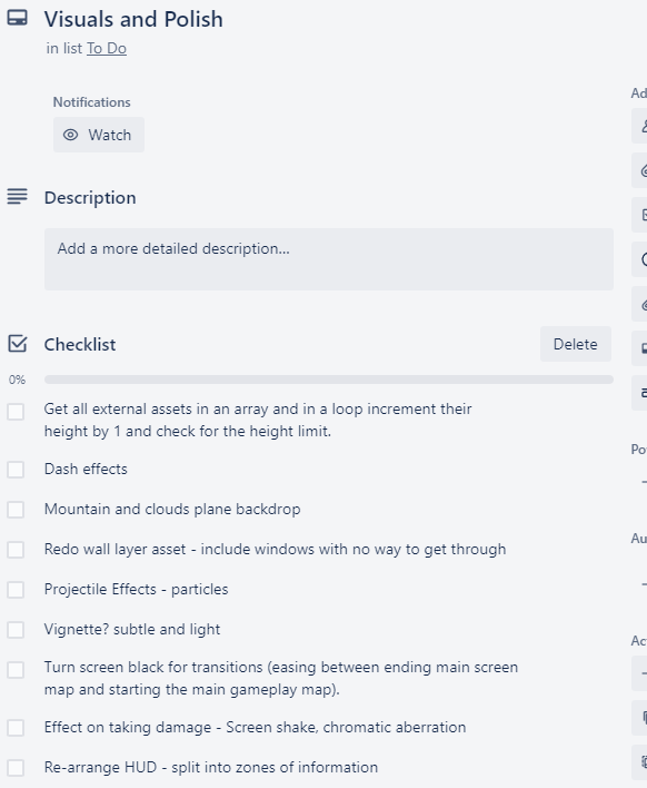 These are lower-priority elements of the game so I won’t work through these just yet but just so I don’t forget about them I’ve added them to a checklist in my trello project page.