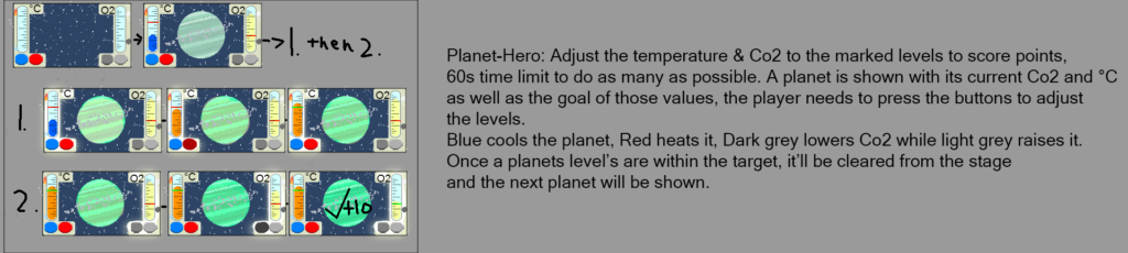 Planet Hero is my favourite idea, only concern is that there’s too many buttons provided to the player, I think a subtle guide would work where the button you need to press and the gauge you need to follow is highlighted while all other elements are dimmed out of the way – Either this or I remove a button from each set and the remaining buttons will be correct. I think this game will be much more challenging due to the setup: 60 second rounds, round setup t o load planet|temp|co2 instance, input to adjust temp then co2 then swap to next planet instance,