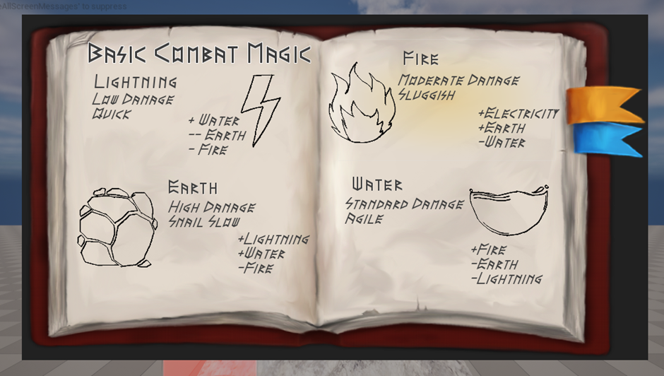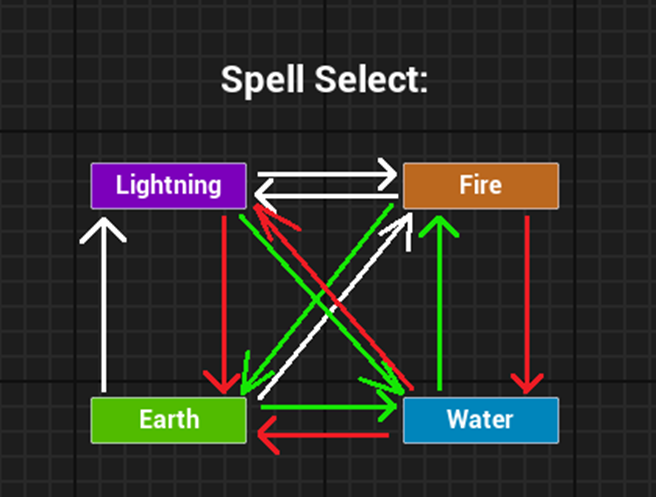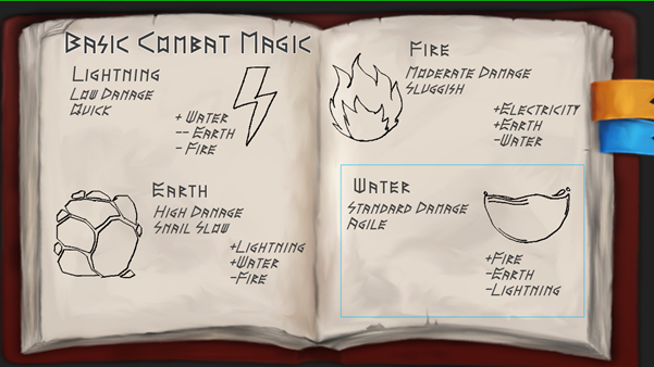 One of the initial mechanics I wanted to use to add more depth to combat is an element system for the spells with strengths/weaknesses, like rock paper scissors and Pokemon where an element is either has NO effective 0x, less effective 0.5x, neutral 1x, effective 1.25x and very effective 1.5x against its target. For this we’ll need to establish what elements we’ll use in the game, this a pretty common system in video games based on what makes sense that it would deal more damage such as electric being strong against water as water is conductive of electricity, or water is strong against fire as water tends to extinguish flames, fire is strong against leaf because natural debris tends to be flammable evidenced by natural forest fires.