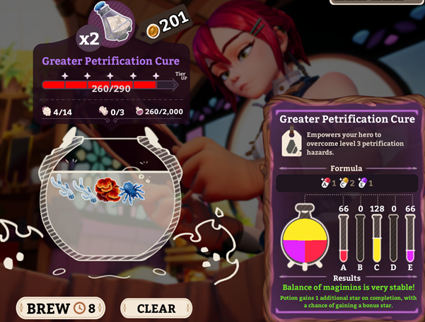 Potions are given one of 6 tiers Minor, Common, Greater, Grand, Superior and Masterwork alongside a subdivision between 0-5 stars based on how many magimins were used in the potion, this determines its base potion value. Depending on how close the magimins ratio is, the potion may receive a bonus of 2 stars with a chance for a third, down to a chance of losing a star, giving the player leeway on how they want to approach potion brewing such as chancing a lower quality potion when they’re short on certain ingredients or even a hail Mary approach of adding high-magimin ingredients to skyrocket the quality.