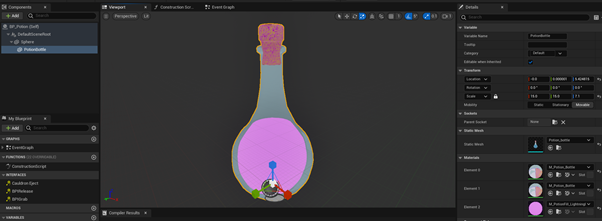 I’ve added two static meshes to the cauldron to represent the cauldron contents, updated when ingredients are added. While setting this up I also took the liberty of adding a switch to stop too many ingredients from being added, and return a success bool for the ingredients actors to use in a branch to prevent their life spans being set when not added to the cauldron.
