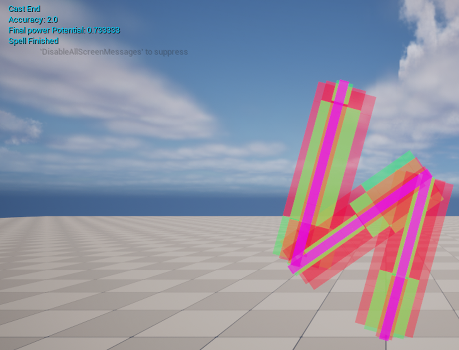 With this, we’ll have a master blueprint for the spell shapes being BP_SpellGuide and we’ll add segments as child actors, on beginplay we’ll get the number of child actors and save it as an integer ‘spell segments’, we’ll check if the spell is done by checking if the number of spells segments scanned is equal to the number of spell segments in the guide. [In hindsight, an alternative solution to track progress and check for the completion condition would have been to deduct 1 from the spell segments variable and check if it’s equal to 0 afterwards].