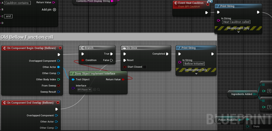 The bellows don’t trigger how I want, where they need to simulate being ‘grabbed’ like the brewing items except the player can’t actually move the transform, I want it to activate if the player holds LMB on the bellows then drag downwards. The hurdle is setting up this interaction to work when only the bellows are overlapped and clicked upon. I can use the brewing item interface but it’ll feed into the player’s holding item blueprint, trigger a reference set and enable tick event – If I add a return bool to BPI_Grab as ‘liftable’ we can check if the grabbable object can be picked up or not to filter whether or not the ref set and tick blueprint should run. After this, I now need to find a way to get the bellows actor to communicate with the cauldron as a child actor, main solution is adding yet another interface function to work as the trigger in place of the bellows overlap event, using ‘get parent actor’ to call this cauldron function should work.