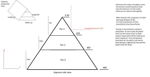 I wanted to experiment with a more simply to set up method using meshes to test for linetrace collisions creating a visual guide in the process, the guide will be a ‘bigger blueprint’ made out a ‘segment’ blueprint that the mouse can collide with effectively making a mouse ‘tight rope’, these will effectively create a shape for the player to trace their mouse through. Mousing over each segment ‘primes’ it which will determine how much HP the spell has.